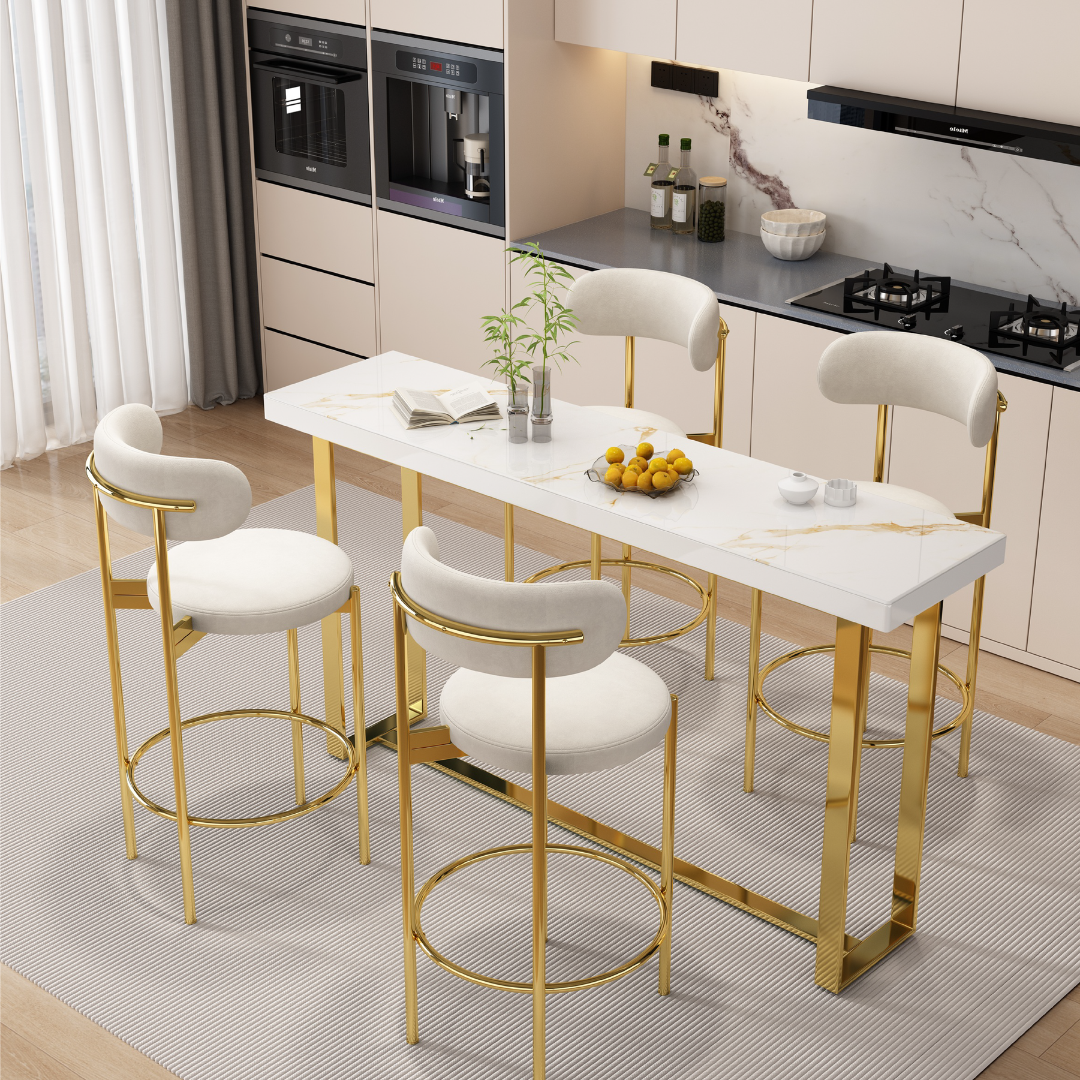 A stylish space for everyday moments. The Naif Bar Set features a white tempered glass top with Calacatta design, gold steel legs, and cozy cream velvet chairs made for comfort and elegance