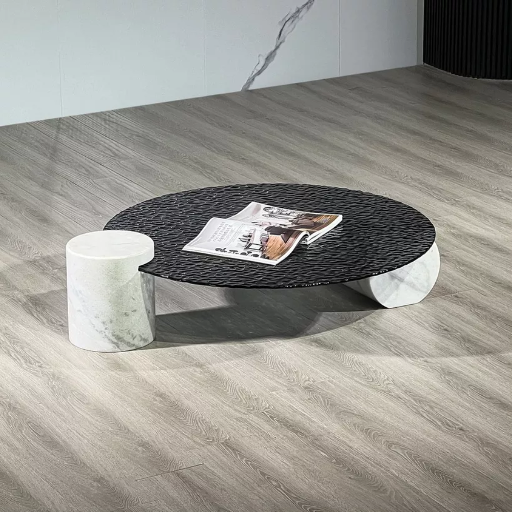Make a statement with this sculptural round coffee table, featuring a textured black glass top and solid marble cylinder legs. It blends artistic form with premium materials, offering a striking contrast between deep black and natural white tones. This visual balance adds depth and drama to any space, while its low-profile silhouette keeps the look sleek and contemporary. Perfect for minimalist and modern interiors, it’s a bold centerpiece that elevates your living room with effortless sophistication